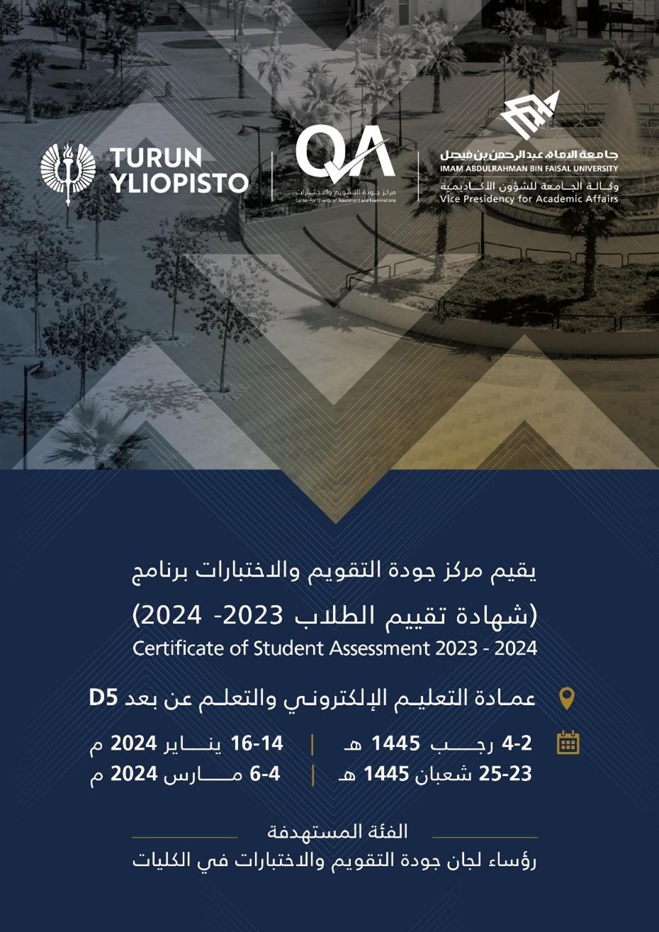 ينطلق يوم الإثنين ٠٤ مارس ٢٠٢٤م المستوى المتقدم لبرنامج شهادة تقييم الطلاب ٢٠٢٣-٢٠٢٤، والمقدم من مركز جودة تقويم الطلاب بالتعاون مع جامعة توركو بفنلندا.